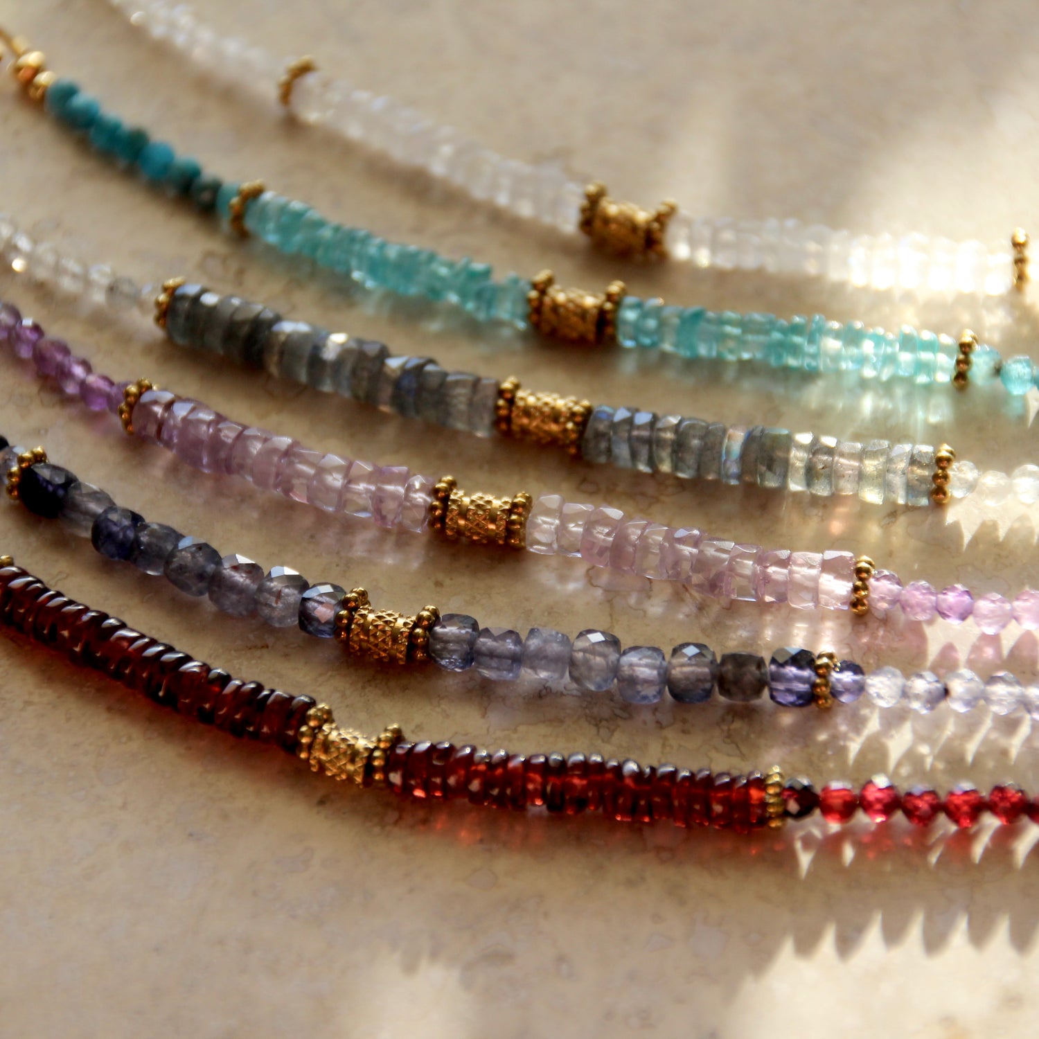 For the ones who follow the stars and listen to their hearts. Apatite stirs inspiration, Amethyst brings calm clarity, Iolite opens the way to intuition, Moonstone glows with femininity, Labradorite shimmers with mystic light and garnet grounds in passion. Paired with ornate detailing that echoes old-world charm, each piece is a keepsake from and a reminder that magic is never far away.