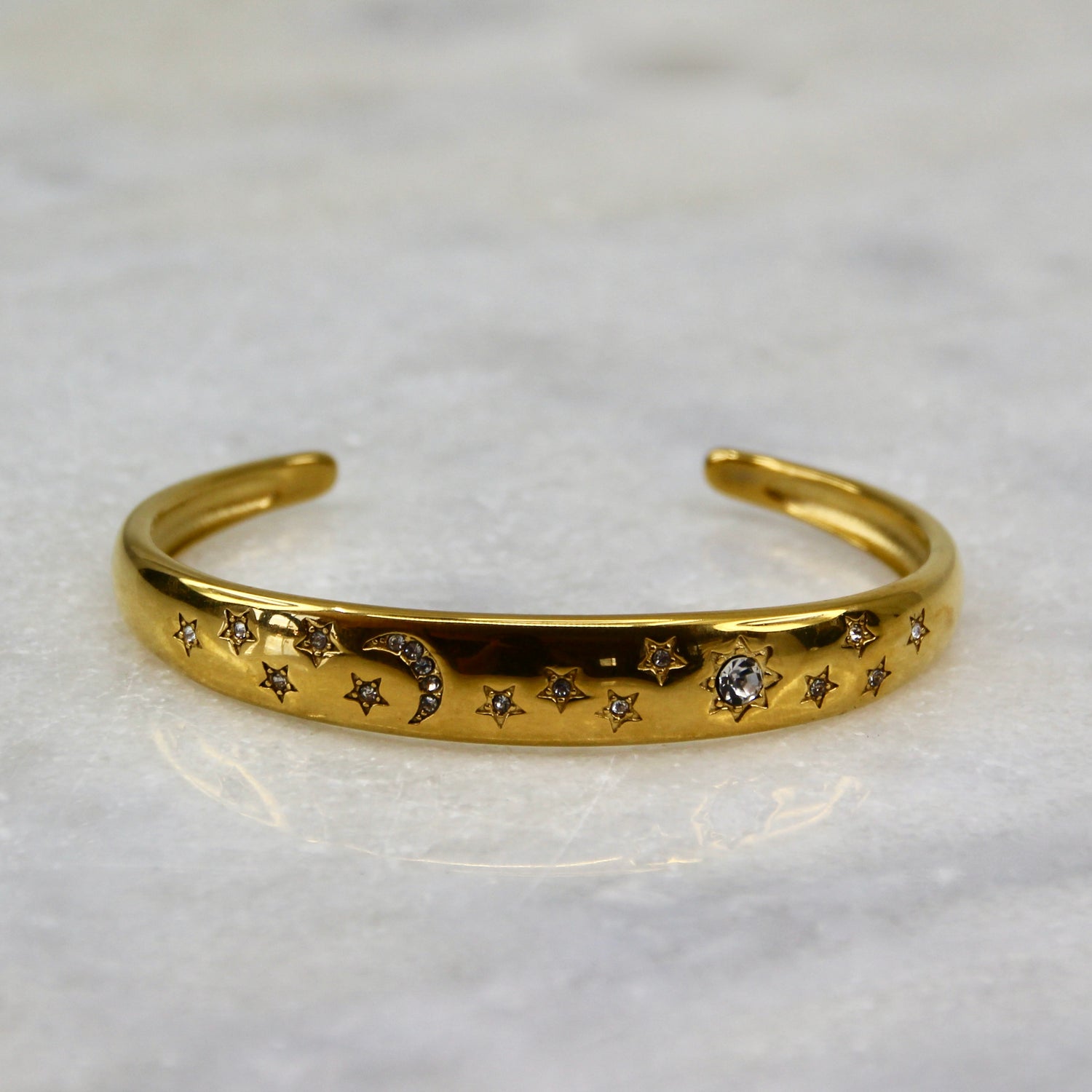 The Celestial Stars Cuff is encrusted with celestial cubic zirconias, crafted from surgical steel and finished with anti tarnish 18ct Gold plating with an adjustable width.