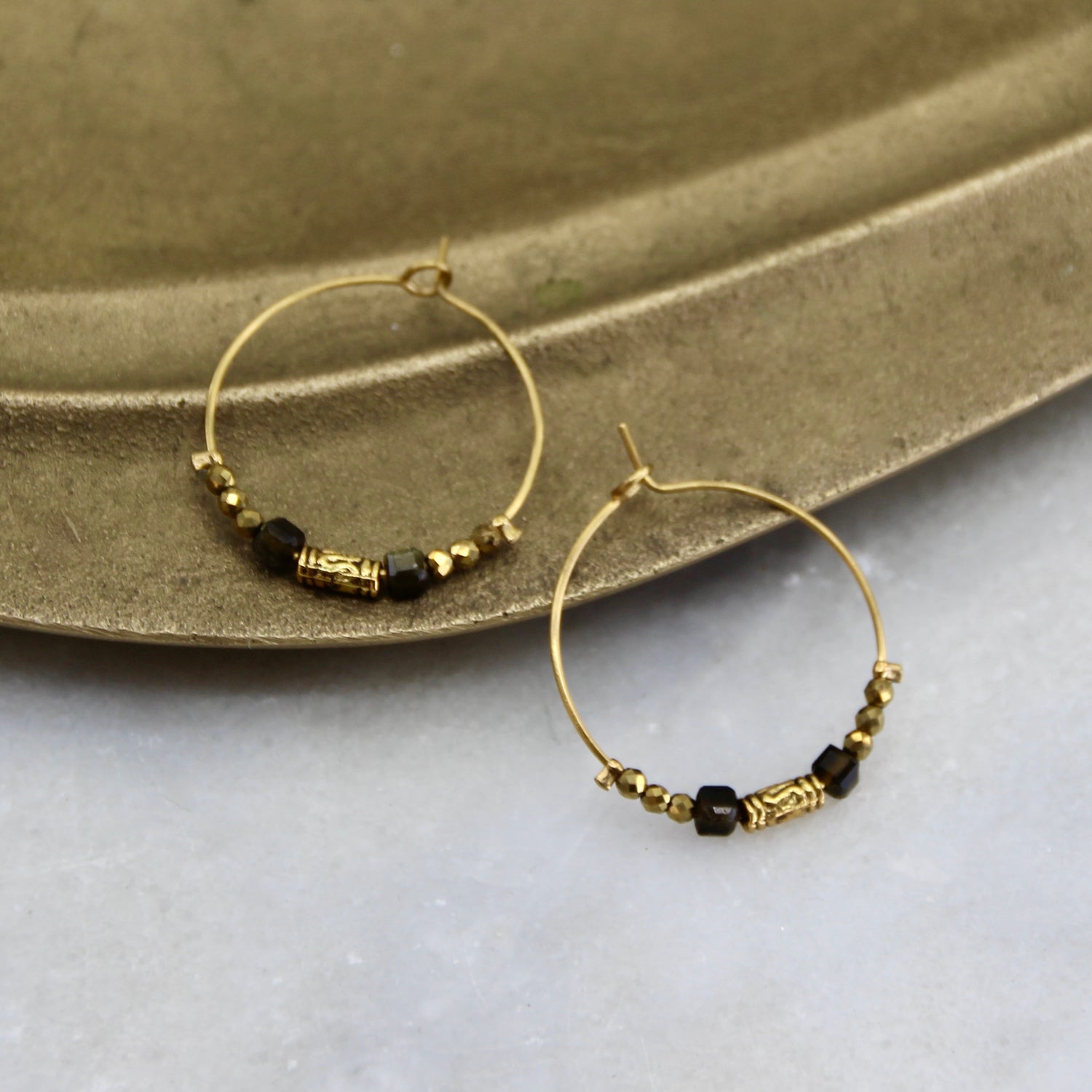 The Nebula's Kiss Hoop showcases a blend of delicate 3mm square-cut Gold Obsidian gemstones, spinel, and refined gold-plated beads. It is completed with anti-tarnish 18ct gold-plated surgical steel fittings and measures 25mm in diameter.