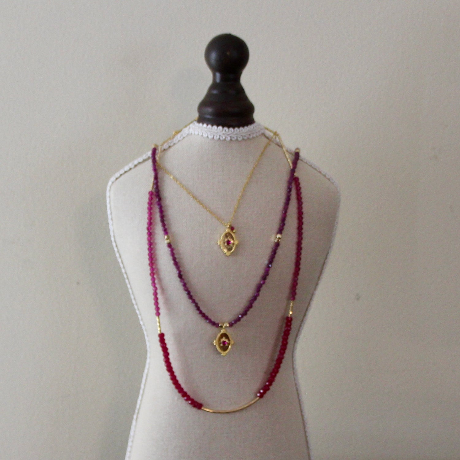 The Nomadic Spell Pendant showcases an antique inspired pendant with a Ruby faceted stone dropped from a delicate chain. Crafted in surgical steel with 18ct gold coating, it resists tarnishing for lasting sparkle. Finished length measures 47cm in length inclusive of an adjustable chain for a customisable fit.