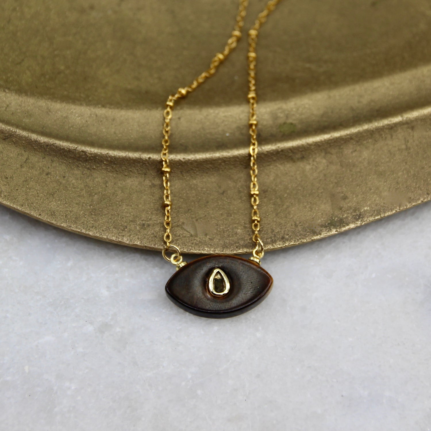 Seer's Sight Eye Pendant showcases a Eye shape stone with refined gold accents and dropped from ball chain. Crafted in surgical steel with 18ct gold coating, it resists tarnishing for lasting sparkle. Finished length measures 47cm in length inclusive of a 5cm adjustable chain for a customisable fit.