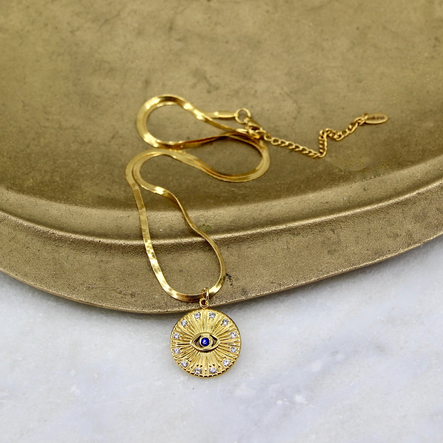 A wanderer’s talisman against bad karma, the Star‑Gaze Eye Amulet pendant features a protective eye, crafted with anti-tarnish 18ct gold-plated surgical steel fittings, it measures 47cm inclusive of a 5cm adjustable chain. Available in 2mm flat snake or fine chain.